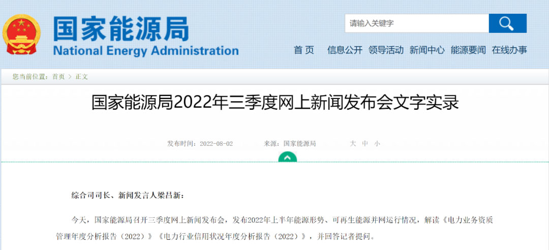 近日,國家能源局召開(kāi)三季度網(wǎng)上新聞發(fā)布會(huì ),發(fā)布2022年上半年能源形勢、可再生能源并網(wǎng)運行情況,并回答記者提問(wèn)。